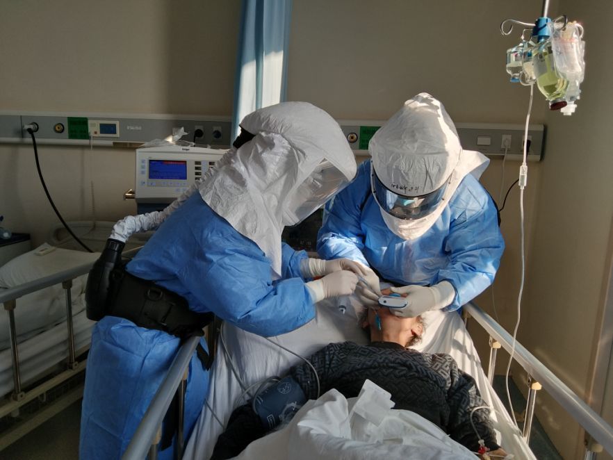 其次,因?yàn)樾鹿诜窝椎闹匕Y病人耐受時(shí)間短,對(duì)醫(yī)護(hù)人員也必須減少暴露時(shí)間,平常3-5分鐘的插管時(shí)間,現(xiàn)在必須在兩分鐘內(nèi)完成??吹讲∪送纯酂o助的樣子,凌肯沒有時(shí)間害怕,在陳向東的指導(dǎo)下,他迅速冷靜,與同事兩人,一個(gè)推麻藥,一個(gè)負(fù)責(zé)插管。整個(gè)過程麻利干脆,用時(shí)90秒。除去60秒打麻藥的過程,真正插管只用了30秒。