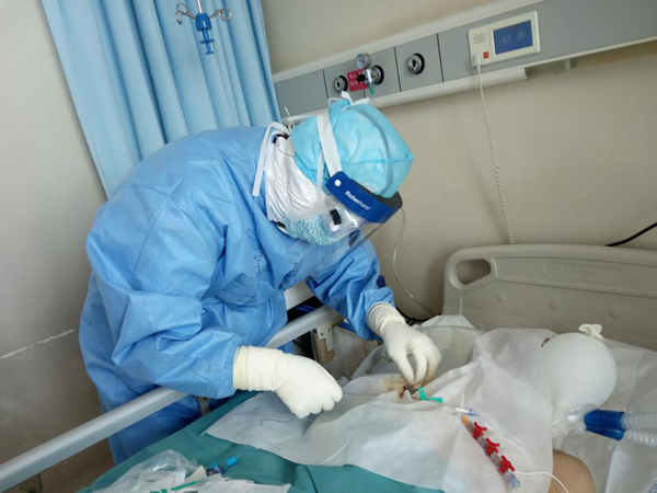 李立斌正在為新冠肺炎危重癥病人實施氣管插管。(受訪者供圖)