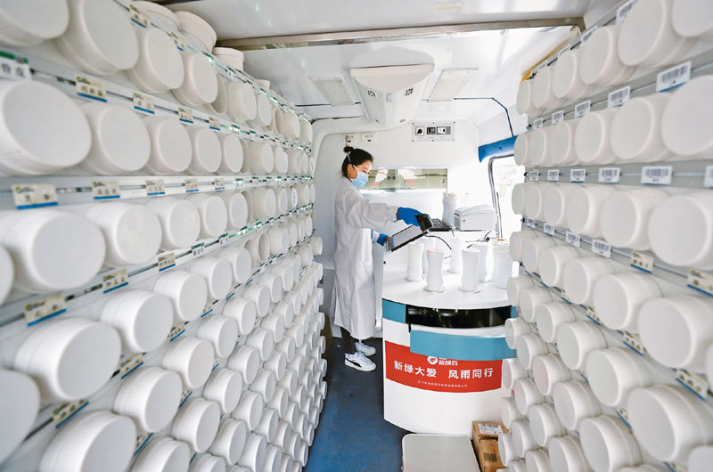 在武漢江夏方艙醫(yī)院的“流動應(yīng)急智能中藥房”里,工作人員把盛有藥方中包含的單味藥的藥瓶取下來后,逐一掃描確認,準備制藥。新華社記者 沈伯韓/攝