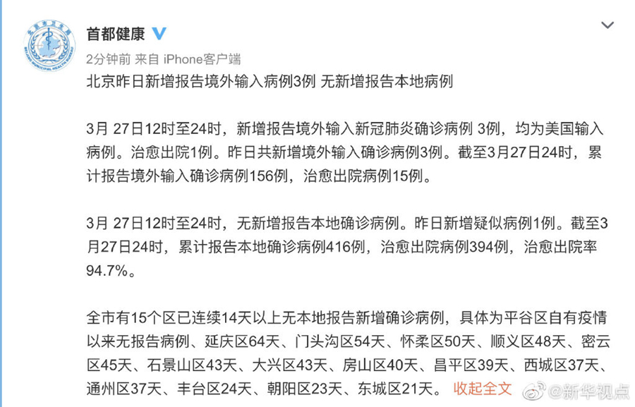 3月27日12時至24時,新增報告境外輸入新冠肺炎確診病例3例,均為美國輸入病例。治愈出院1例。昨日共新增境外輸入確診病例3例。截至3月27日24時,累計報告境外輸入確診病例156例,治愈出院病例15例。