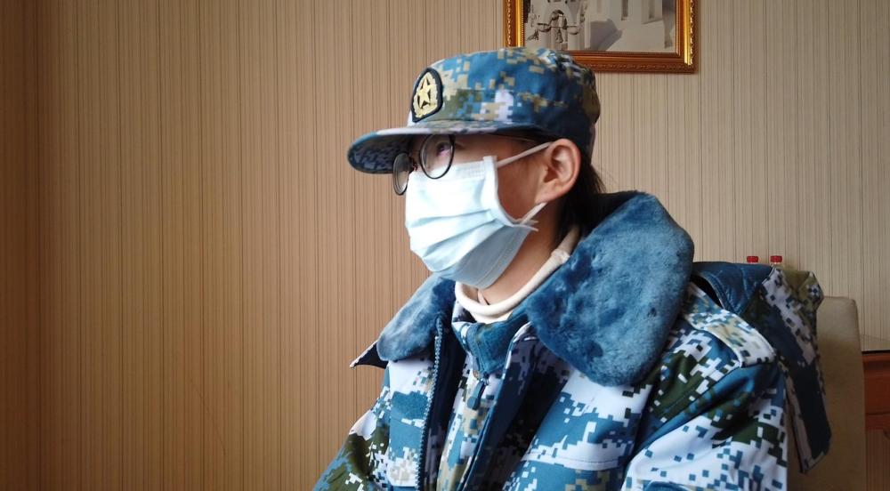 圖為解放軍援助湖北醫(yī)療隊隊員呂蓉在接受采訪。