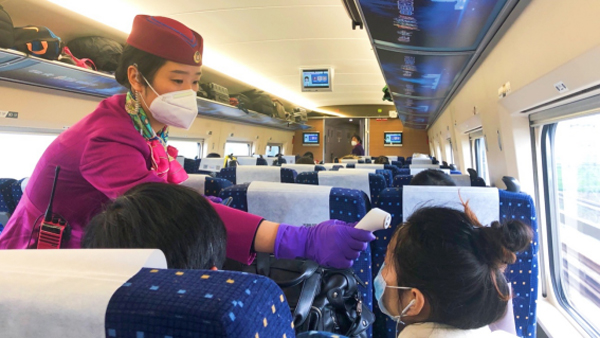 4、測(cè)溫:專列內(nèi)幾乎滿座,餐飲等服務(wù)照常進(jìn)行,乘務(wù)員定時(shí)為乘客測(cè)量體溫。