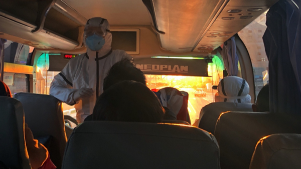 6、抵達(dá):17:45,專列抵達(dá)北京西站,乘客根據(jù)指引到所在區(qū)的集合地點(diǎn)集合,統(tǒng)一前往區(qū)里安排的分流地點(diǎn)。記者乘坐豐臺(tái)區(qū)組織的大巴,前往豐臺(tái)體育中心。