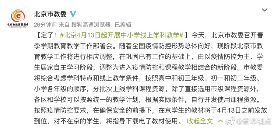 定了!北京4月13日起開展中小學線上學科教學-新華網(wǎng)