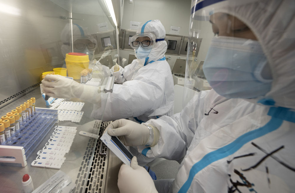↑34日,在武漢雷神山醫(yī)院醫(yī)學檢驗科,工作人員在對患者的血液樣本進行檢測。