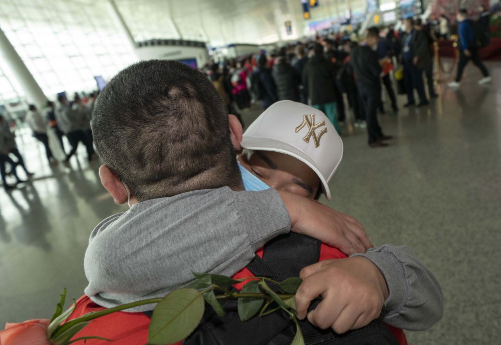 ↑319日,在武漢天河機場,河南醫(yī)療隊隊員郭燕姿緊緊抱住丈夫王國曉。 夫妻二人都來自河南新鄉(xiāng),王國曉是醫(yī)生,郭燕姿是護士長。29日,夫妻倆馳援武漢,隨后,郭燕姿被分配到青山方艙醫(yī)院工作,而王國曉則被分配到了另外一個區(qū)。從那以后,夫妻倆已有一個多月沒有見面。319日當天,夫妻倆在機場重逢。