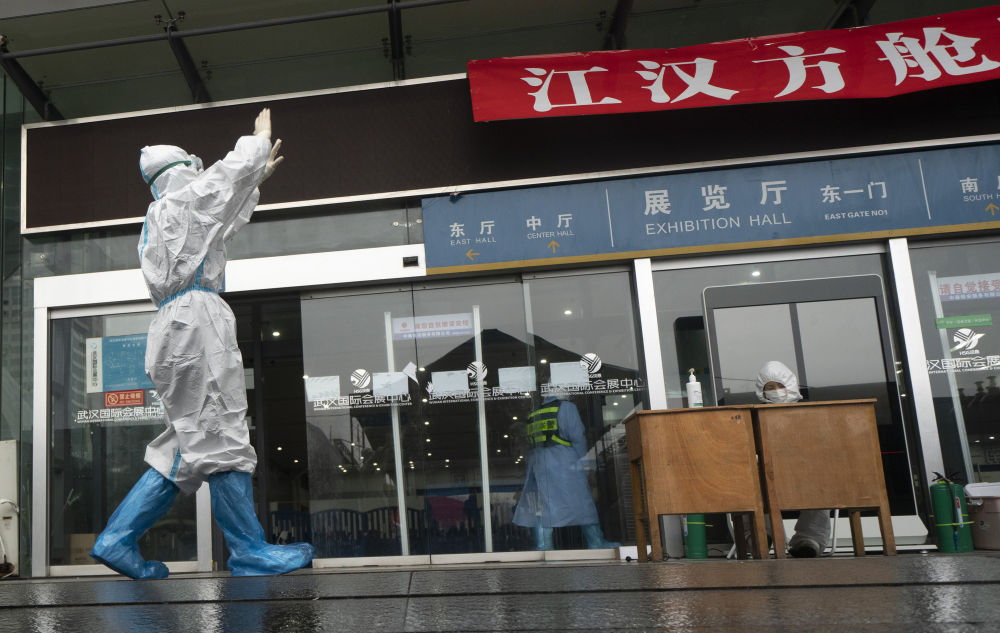 ↑39日,最后一位走出江漢方艙醫(yī)院的醫(yī)護人員、武漢協(xié)和醫(yī)院醫(yī)生逯翀向方艙醫(yī)院揮手告別。