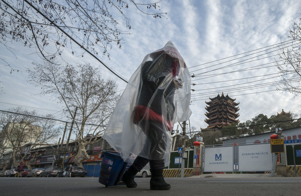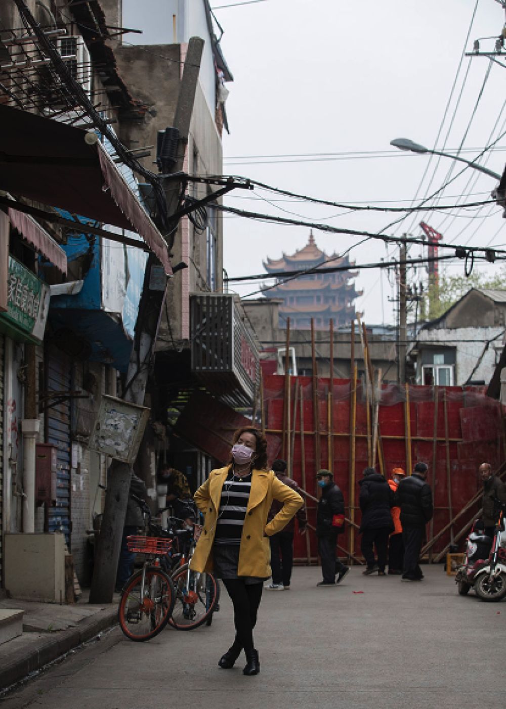↑315日,一位身穿自制“防護服”的女士上街買菜時從黃鶴樓下走過。她說她近兩個月來,只出過兩次門。