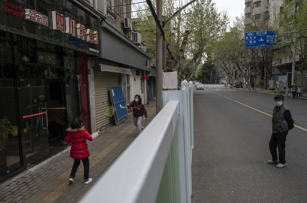 ↑41日,在武漢的一個社區(qū)里,人們在隔離墻內(nèi)打打羽毛球。