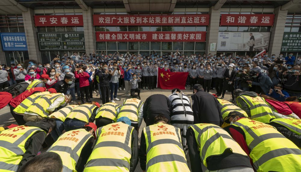 ↑319日,在河南醫(yī)療隊駐地,工作人員、志愿者和酒店職工鞠躬感謝即將踏上歸程的河南醫(yī)療隊成員。