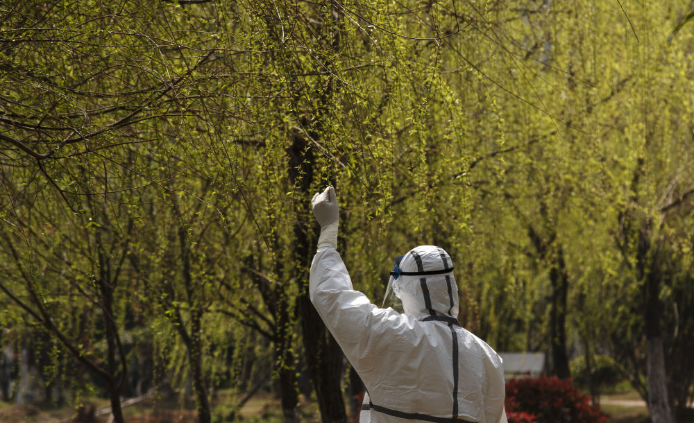 ↑314日,在華中科技大學同濟醫(yī)學院附屬同濟醫(yī)院光谷院區(qū),負責新冠病毒肺炎患者轉(zhuǎn)運的云南醫(yī)療隊隊員姚紅軍伸手觸摸剛剛發(fā)芽的柳枝。