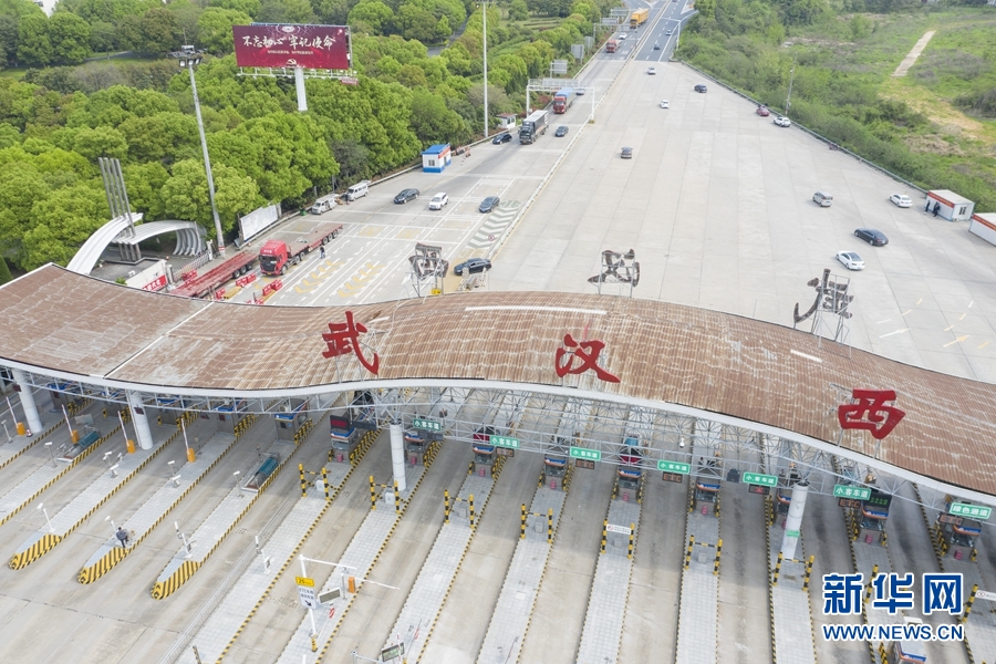 4月8日,車輛有序通過武漢西高速收費(fèi)站(無人機(jī)照片)。新華社記者 才揚(yáng) 攝