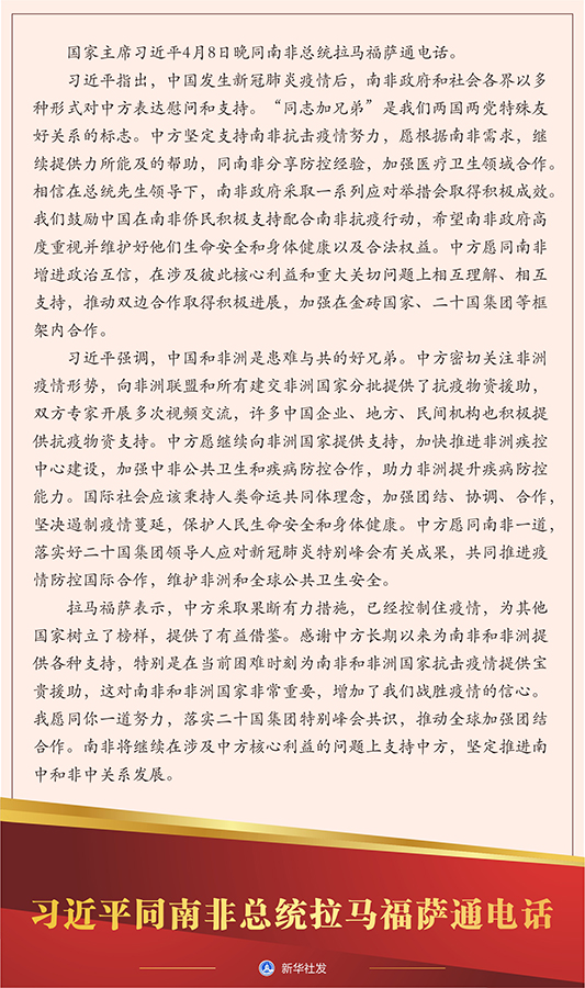 習(xí)近平指出,中國(guó)發(fā)生新冠肺炎疫情后,南非政府和社會(huì)各界以多種形式對(duì)中方表達(dá)慰問(wèn)和支持?!巴炯有值堋笔俏覀儍蓢?guó)兩黨特殊友好關(guān)系的標(biāo)志。中方堅(jiān)定支持南非抗擊疫情努力,愿根據(jù)南非需求,繼續(xù)提供力所能及的幫助,同南非分享防控經(jīng)驗(yàn),加強(qiáng)醫(yī)療衛(wèi)生領(lǐng)域合作。相信在總統(tǒng)先生領(lǐng)導(dǎo)下,南非政府采取一系列應(yīng)對(duì)舉措會(huì)取得積極成效。我們鼓勵(lì)中國(guó)在南非僑民積極支持配合南非抗疫行動(dòng),希望南非政府高度重視并維護(hù)好他們生命安全和身體健康以及合法權(quán)益。中方愿同南非增進(jìn)政治互信,在涉及彼此核心利益和重大關(guān)切問(wèn)題上相互理解、相互支持,推動(dòng)雙邊合作取得積極進(jìn)展,加強(qiáng)在金磚國(guó)家、二十國(guó)集團(tuán)等框架內(nèi)合作。