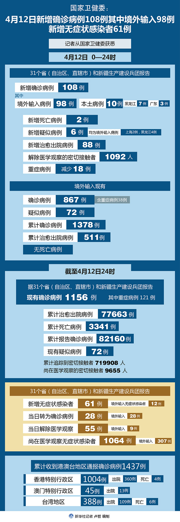 截至4月12日24時,據(jù)31個?。ㄗ灾螀^(qū)、直轄市)和新疆生產(chǎn)建設兵團報告,現(xiàn)有確診病例1156例(其中重癥病例121例),累計治愈出院病例77663例,累計死亡病例3341例,累計報告確診病例82160例,現(xiàn)有疑似病例72例。累計追蹤到密切接觸者719908人,尚在醫(yī)學觀察的密切接觸者9655人。