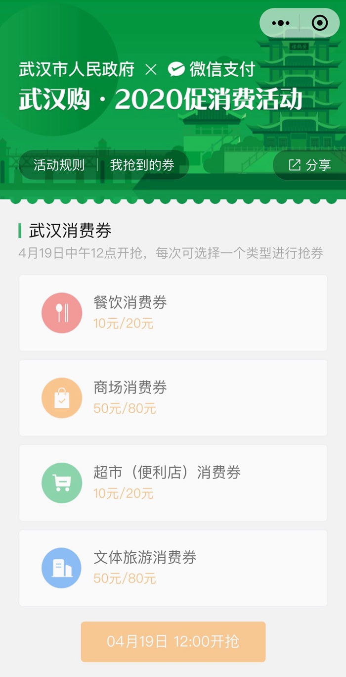 根據安排,“武漢消費券”將在阿里巴巴、美團點評、騰訊等3家企業(yè)自有線上平臺上按周投放,總體投放分兩期執(zhí)行。其中,第一期為4月19日至5月31日,首次投放活動將在4月19日中午12時進行,在漢人員可登錄支付寶、美團、大眾點評、微信等手機程序,搜索“武漢”“消費券”等關鍵詞進入活動頁面參與領券。第二期為6月1日至7月31日,具體投放時間另行公布。