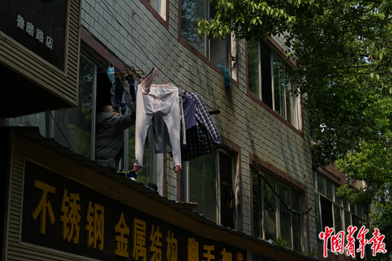 封城期間,一位社區(qū)居民直接將衣服晾曬在窗外的繩子上。