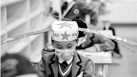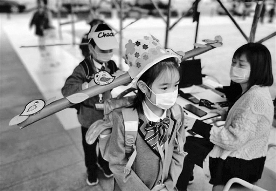 學校還由此提出“頭戴一米帽、保持一米距”的倡議,要求小朋友們爭取戴一天帽子不壞,不能碰到別人。此外,當天要選出最童趣、最有創(chuàng)意、最佳制作的九頂帽子,舉辦“一研九頂”全校展覽。