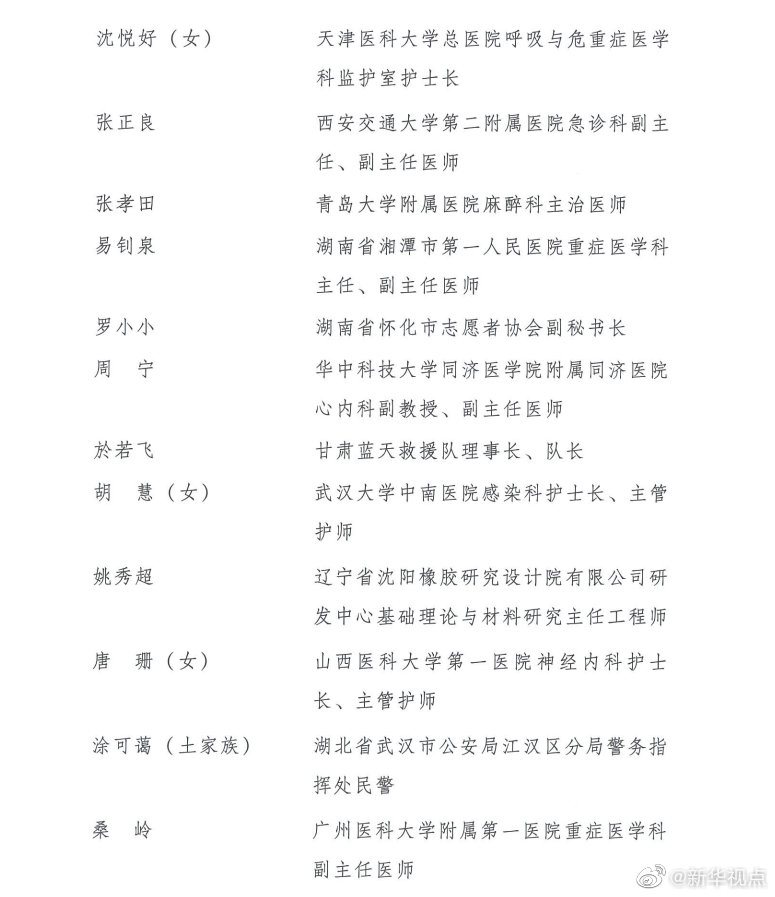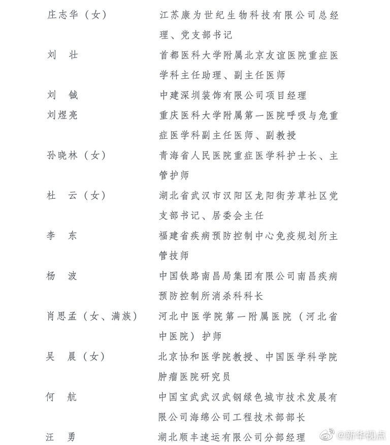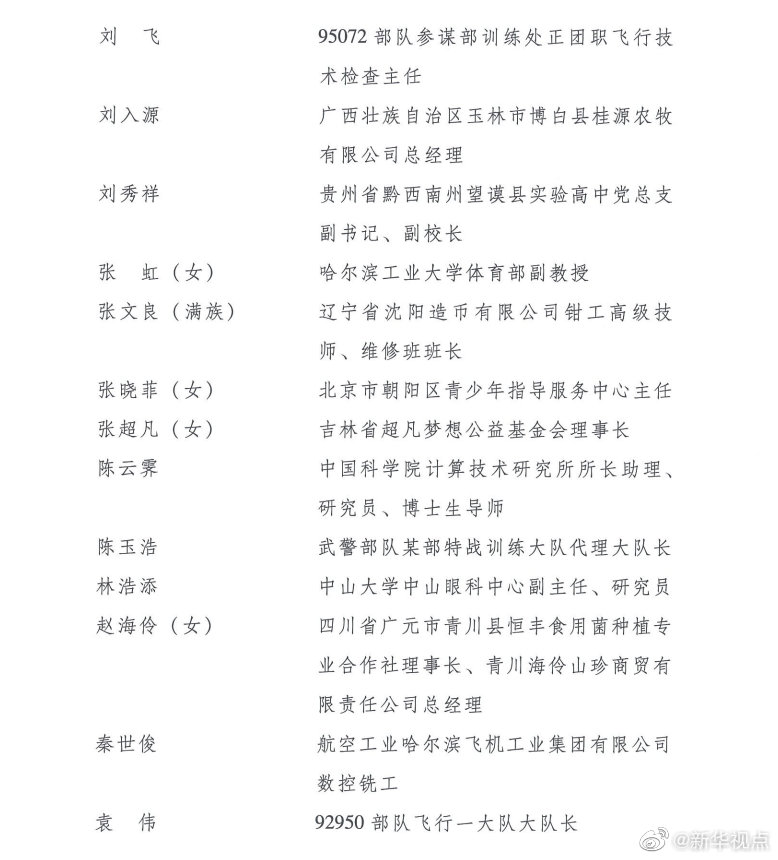 榮獲第24屆“中國青年五四獎?wù)隆钡姆謩e是:江蘇省南京市鼓樓區(qū)方家營消防救援站站長助理、三級消防長丁良浩,安徽省滁州市定遠(yuǎn)縣吳圩鎮(zhèn)西孔村黨總支第一書記王萌萌(女),廈門大學(xué)航空航天學(xué)院常務(wù)副院長、特聘教授、博士生導(dǎo)師尤延鋮,湖北省黃岡市羅田縣希望小學(xué)校長方榮(女),浙江每日互動網(wǎng)絡(luò)科技股份有限公司董事長兼總經(jīng)理、黨委書記方毅,浙江省杭州市拱墅區(qū)職業(yè)高級中學(xué)美發(fā)專業(yè)教師石丹(女),國家超級計(jì)算無錫中心副主任付昊桓,中國石油大港油田公司第二采油廠作業(yè)二區(qū)注采二組副組長馮萌萌(女),寧夏回族自治區(qū)石嘴山市中醫(yī)醫(yī)院副主任醫(yī)師朱斌,中國國家女子排球隊(duì)隊(duì)員、隊(duì)長朱婷(女),95072部隊(duì)參謀部訓(xùn)練處正團(tuán)職飛行技術(shù)檢查主任劉飛,廣西壯族自治區(qū)玉林市博白縣桂源農(nóng)牧有限公司總經(jīng)理劉入源,貴州省黔西南州望謨縣實(shí)驗(yàn)高中黨總支副書記、副校長劉秀祥,哈爾濱工業(yè)大學(xué)體育部副教授張虹(女),遼寧省沈陽造幣有限公司鉗工高級技師、維修班班長張文良(滿族),北京市朝陽區(qū)青少年指導(dǎo)服務(wù)中心主任張曉菲(女),吉林省超凡夢想公益基金會理事長張超凡(女),中國科學(xué)院計(jì)算技術(shù)研究所所長助理、研究員、博士生導(dǎo)師陳云霽,武警部隊(duì)某部特戰(zhàn)訓(xùn)練大隊(duì)代理大隊(duì)長陳玉浩,中山大學(xué)中山眼科中心副主任、研究員林浩添,四川省廣元市青川縣恒豐食用菌種植專業(yè)合作社理事長、青川海伶山珍商貿(mào)有限責(zé)任公司總經(jīng)理趙海伶(女),航空工業(yè)哈爾濱飛機(jī)工業(yè)集團(tuán)有限公司數(shù)控銑工秦世俊,92950部隊(duì)飛行一大隊(duì)大隊(duì)長袁偉,中鐵二局磨萬鐵路第Ⅵ標(biāo)項(xiàng)目經(jīng)理部第一分部二工區(qū)工區(qū)長、高級工程師徐州,博奧賽斯(天津)生物科技有限公司董事長欒大偉,港珠澳大橋管理局副總工程師、教授級高級工程師景強(qiáng),湖北省咸寧市崇陽縣白霓鎮(zhèn)大市村黨支部書記程桔(女),山東省七兵堂集團(tuán)股份有限公司董事長、黨支部書記謝清森,江蘇蘇寧物流有限公司快遞員潘虎,南京大學(xué)醫(yī)學(xué)院附屬鼓樓醫(yī)院腫瘤科行政副主任、南京大學(xué)臨床腫瘤學(xué)研究所副所長、博士生導(dǎo)師魏嘉(女),中國醫(yī)科大學(xué)附屬第一醫(yī)院重癥醫(yī)學(xué)科黨支部書記、副主任,教授、主任醫(yī)師丁仁彧,內(nèi)蒙古自治區(qū)第四醫(yī)院護(hù)士長、副主任護(hù)師王穎麗(女、蒙古族),四川省醫(yī)學(xué)科學(xué)院·四川省人民醫(yī)院EICU副主任醫(yī)師鄧?yán)?,浙江省杭州市中醫(yī)院重癥監(jiān)護(hù)室副護(hù)士長朱佳清(女),江蘇康為世紀(jì)生物科技有限公司總經(jīng)理、黨支部書記莊志華(女),首都醫(yī)科大學(xué)附屬北京友誼醫(yī)院重癥醫(yī)學(xué)科主任助理、副主任醫(yī)師劉壯,中建深圳裝飾有限公司項(xiàng)目經(jīng)理劉鋮,重慶醫(yī)科大學(xué)附屬第一醫(yī)院呼吸與危重癥醫(yī)學(xué)科副主任醫(yī)師、副教授劉煜亮,青海省人民醫(yī)院重癥醫(yī)學(xué)科護(hù)士長、主管護(hù)師孫曉林(女),湖北省武漢市漢陽區(qū)龍陽街芳草社區(qū)黨支部書記、居委會主任杜云(女),福建省疾病預(yù)防控制中心免疫規(guī)劃所主管技師李東,中國鐵路南昌局集團(tuán)有限公司南昌疾病預(yù)防控制所消殺科科長楊波,河北中醫(yī)學(xué)院第一附屬醫(yī)院(河北省中醫(yī)院)護(hù)師肖思孟(女、滿族),北京協(xié)和醫(yī)學(xué)院教授、中國醫(yī)學(xué)科學(xué)院腫瘤醫(yī)院研究員吳晨(女),中國寶武武漢武鋼綠色城市技術(shù)發(fā)展有限公司海綿公司工程技術(shù)部部長何航,湖北順豐速運(yùn)有限公司分部經(jīng)理汪勇,天津醫(yī)科大學(xué)總醫(yī)院呼吸與危重癥醫(yī)學(xué)科監(jiān)護(hù)室護(hù)士長沈悅好(女),西安交通大學(xué)第二附屬醫(yī)院急診科副主任、副主任醫(yī)師張正良,青島大學(xué)附屬醫(yī)院麻醉科主治醫(yī)師張孝田,湖南省湘潭市第一人民醫(yī)院重癥醫(yī)學(xué)科主任、副主任醫(yī)師易釗泉,湖南省懷化市志愿者協(xié)會副秘書長羅小小,華中科技大學(xué)同濟(jì)醫(yī)學(xué)院附屬同濟(jì)醫(yī)院心內(nèi)科副教授、副主任醫(yī)師周寧,甘肅藍(lán)天救援隊(duì)理事長、隊(duì)長於若飛,武漢大學(xué)中南醫(yī)院感染科護(hù)士長、主管護(hù)師胡慧(女),遼寧省沈陽橡膠研究設(shè)計(jì)院有限公司研發(fā)中心基礎(chǔ)理論與材料研究主任工程師姚秀超,山西醫(yī)科大學(xué)第一醫(yī)院神經(jīng)內(nèi)科護(hù)士長、主管護(hù)師唐珊(女),湖北省武漢市公安局江漢區(qū)分局警務(wù)指揮處民警涂可藹(土家族),廣州醫(yī)科大學(xué)附屬第一醫(yī)院重癥醫(yī)學(xué)科副主任醫(yī)師桑嶺,湖北省武漢市第三醫(yī)院重癥醫(yī)學(xué)科副主任醫(yī)師董芳(女),東南大學(xué)附屬中大醫(yī)院重癥醫(yī)學(xué)科主任醫(yī)師潘純。