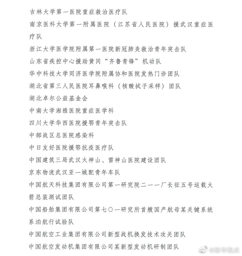 榮獲“中國青年五四獎?wù)录w”的分別是:北汽福田國慶70周年群眾游行彩車底盤制作和技術(shù)保障團(tuán)隊(duì),天津飛騰嵌入式CPU研發(fā)團(tuán)隊(duì),河北醫(yī)科大學(xué)第一醫(yī)院“先心病”愛心團(tuán)隊(duì),太鋼集團(tuán)不銹鋼“手撕鋼”創(chuàng)新研發(fā)團(tuán)隊(duì),哈爾濱工業(yè)大學(xué)紫丁香學(xué)生微納衛(wèi)星團(tuán)隊(duì),諸暨市公安局楓橋派出所,科大訊飛認(rèn)知智能國家重點(diǎn)實(shí)驗(yàn)室創(chuàng)新團(tuán)隊(duì),南昌大學(xué)“稻漁工程”團(tuán)隊(duì),濰柴青年科技創(chuàng)新團(tuán)隊(duì),中國散裂中子源建設(shè)團(tuán)隊(duì),中國航發(fā)渦輪院某發(fā)動機(jī)研制團(tuán)隊(duì),甘肅省無償捐獻(xiàn)遺體器官志愿服務(wù)隊(duì),清華大學(xué)研究生支教團(tuán)青海湟中分隊(duì),73022部隊(duì)56分隊(duì),新一代精打體系武器系統(tǒng)青年創(chuàng)新團(tuán)隊(duì),北京大學(xué)援鄂抗疫醫(yī)療隊(duì),中國醫(yī)科大學(xué)新冠肺炎疫情防控醫(yī)療總隊(duì),吉林大學(xué)第一醫(yī)院重癥救治醫(yī)療隊(duì),南京醫(yī)科大學(xué)第一附屬醫(yī)院(江蘇省人民醫(yī)院)援武漢重癥醫(yī)療隊(duì),浙江大學(xué)醫(yī)學(xué)院附屬第一醫(yī)院新冠肺炎救治青年突擊隊(duì),山東省疾控中心援助黃岡“齊魯青鋒”機(jī)動隊(duì),華中科技大學(xué)同濟(jì)醫(yī)學(xué)院附屬協(xié)和醫(yī)院發(fā)熱門診團(tuán)隊(duì),湖北省第三人民醫(yī)院耳鼻喉科(核酸拭子采樣)團(tuán)隊(duì),湖北卓爾公益基金會,中南大學(xué)湘雅醫(yī)院重癥醫(yī)學(xué)科,四川大學(xué)華西醫(yī)院援鄂青年突擊隊(duì),中部戰(zhàn)區(qū)總醫(yī)院感染科,中日友好醫(yī)院援鄂抗疫醫(yī)療隊(duì),中國建筑三局武漢火神山、雷神山醫(yī)院建設(shè)團(tuán)隊(duì),京東物流武漢亞一城配青年車隊(duì),中國航天科技集團(tuán)有限公司第一研究院二一一廠長征五號運(yùn)載火箭總裝測試團(tuán)隊(duì),中國船舶集團(tuán)有限公司第七〇一研究所首艘國產(chǎn)航母某關(guān)鍵系統(tǒng)系泊航行試驗(yàn)隊(duì),中國航空工業(yè)集團(tuán)有限公司新型戰(zhàn)機(jī)換發(fā)技術(shù)攻關(guān)團(tuán)隊(duì),中國航空發(fā)動機(jī)集團(tuán)有限公司某新型發(fā)動機(jī)研制團(tuán)隊(duì)。