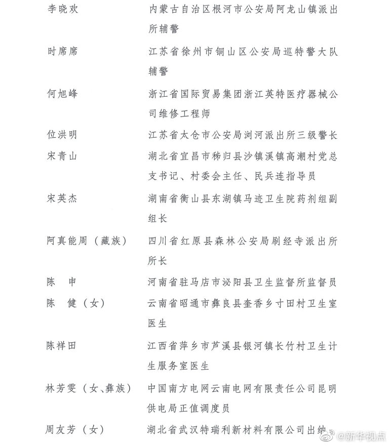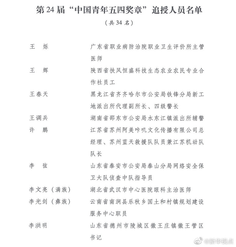 第24屆“中國青年五四獎?wù)隆弊肥谌藛T分別是:廣東省職業(yè)病防治院職業(yè)衛(wèi)生評價所主管醫(yī)師王爍,陜西省扶風(fēng)恒盛科技生態(tài)農(nóng)業(yè)農(nóng)民專業(yè)合作社員工王輝,黑龍江省齊齊哈爾市公安局鐵鋒分局新工地派出所代理副所長、四級警長王春天,湖南省邵東市公安局水東江鎮(zhèn)派出所輔警王調(diào)兵,江蘇省蘇州阿美咔嘰文化傳播有限公司總經(jīng)理、蘇州藍(lán)天救援隊(duì)隊(duì)員兼江蘇機(jī)動隊(duì)隊(duì)長許鵬,山東省泰安市公安局泰山分局網(wǎng)絡(luò)安全保衛(wèi)大隊(duì)偵查中隊(duì)指導(dǎo)員李弦,湖北省武漢市中心醫(yī)院眼科主治醫(yī)師李文亮(滿族),云南省南澗縣樂秋鄉(xiāng)國土和村鎮(zhèn)規(guī)劃建設(shè)服務(wù)中心職員李光劍(彝族),山東省德州市陵城區(qū)徽王莊鎮(zhèn)徽王管區(qū)書記李洪明,內(nèi)蒙古自治區(qū)根河市公安局阿龍山鎮(zhèn)派出所輔警李曉歡,江蘇省徐州市銅山區(qū)公安局巡特警大隊(duì)輔警時席席,浙江省國際貿(mào)易集團(tuán)浙江英特醫(yī)療器械公司維修工程師何旭峰,江蘇省太倉市公安局瀏河派出所三級警長位洪明,湖北省宜昌市秭歸縣沙鎮(zhèn)溪鎮(zhèn)高潮村黨總支書記、村委會主任、民兵連指導(dǎo)員宋青山,湖南省衡山縣東湖鎮(zhèn)馬跡衛(wèi)生院藥劑組副組長宋英杰,四川省紅原縣森林公安局刷經(jīng)寺派出所所長阿真能周(藏族),河南省駐馬店市泌陽縣衛(wèi)生監(jiān)督所監(jiān)督員陳申,云南省昭通市彝良縣奎香鄉(xiāng)寸田村衛(wèi)生室醫(yī)生陳?。ㄅ魇∑监l(xiāng)市蘆溪縣銀河鎮(zhèn)長竹村衛(wèi)生計(jì)生服務(wù)室醫(yī)生陳祥田,中國南方電網(wǎng)云南電網(wǎng)有限責(zé)任公司昆明供電局正值調(diào)度員林芳雯(女、彝族),湖北省武漢特瑞利新材料有限公司出納周友芳(女),安徽省銅陵市樅陽縣公安局特(巡)警大隊(duì)輔警一中隊(duì)副隊(duì)長胡鋒,四川省甘孜藏族自治州得榮縣龍絨寺寺廟管理委員會主任洛絨益西(藏族),四川省廣元經(jīng)開區(qū)盤龍鎮(zhèn)深溝村村民宮高明,江蘇省南京市公安局高淳分局淳溪派出所輔警袁劍雄,山東省泰安市岱岳區(qū)角峪鎮(zhèn)先鋒村村民賈慶臣,湖北省武漢市蔡甸區(qū)人民醫(yī)院住院醫(yī)師夏思思(女),江蘇省南京市公安局行政審批服務(wù)處網(wǎng)絡(luò)政務(wù)科一級警員徐昊,江蘇省徐州市沛縣公安局五段派出所輔警章良志,湖北省武漢市江夏區(qū)第一人民醫(yī)院醫(yī)師彭銀華,廣東省英德市公安局橋頭派出所輔警曾文聰,江西省蓮花縣湖上鄉(xiāng)中心衛(wèi)生院醫(yī)生熊波,河南省鄭州市公安局東風(fēng)路分局治安管理服務(wù)大隊(duì)三中隊(duì)民警、四級警長樊樹鋒,甘肅省舟曲縣扶貧辦副主任張小娟(女、藏族)。