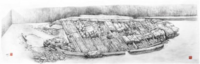 早期的考古現場都會采用帶有透視方法的素描速寫方法進行現場記錄。半坡遺址、廣州南越王墓考古現場都曾專門請畫家到現場繪制素描圖。此圖繪制于2015年12月。作為現場發(fā)掘的參與者,作者負責現場測繪和畫圖的工作,每天都留意著沉船隨著發(fā)掘進度而產生的變化。