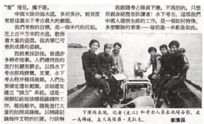 1990年定海水下考古培訓時,記者(照片左二)也曾下水,設法近距離觀察遺址狀況和隊員們的工作。崔勇(照片右一)是記者在水下的守護人之一。人民日報海外版也是最早詳細報道中國水下考古事業(yè)發(fā)展的新聞媒體。 (本報資料照片)