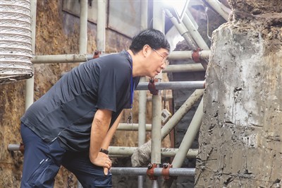 這張照片拍攝于2020年4月26日??脊抨爢T拍到了他們領隊崔勇做現場評估的場景。在沉船的外圍,已經進展到發(fā)掘外側反斜面位置,此時支護要預防船向下和向外的移位。支架太疏帶來風險,太密則會影響發(fā)掘。 鄧嘉韶攝