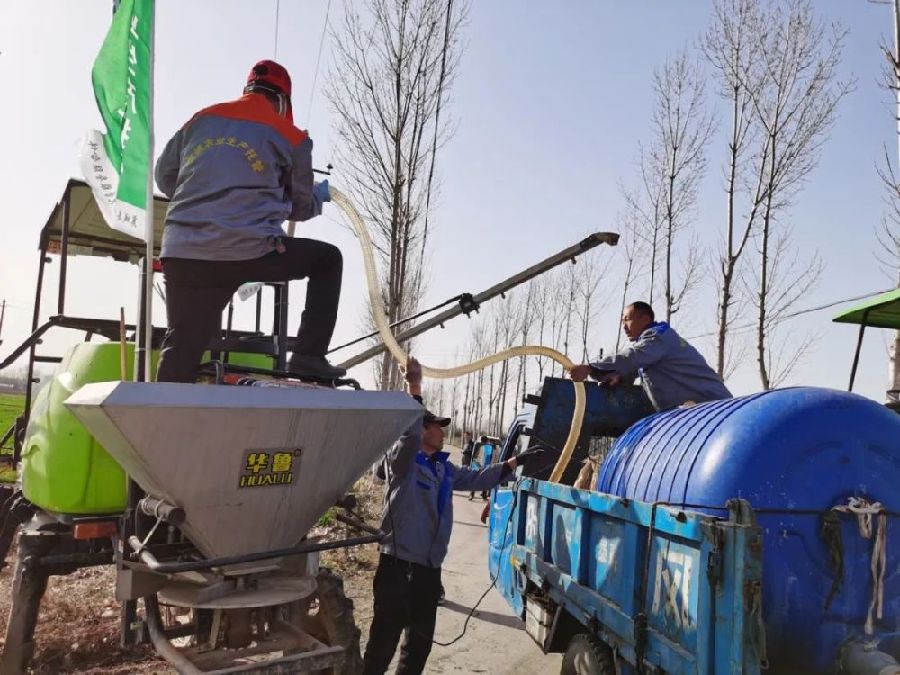 農(nóng)機手接單后,前往農(nóng)田進行農(nóng)業(yè)勞務(wù)服務(wù)。圖為給自走式噴霧機加注“除草劑” 李虎威 攝