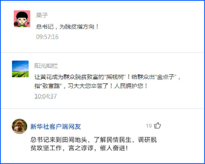 消息播發(fā)后,引起網(wǎng)民熱烈反響。大家紛紛為總書(shū)記關(guān)心脫貧攻堅(jiān)、親自指導(dǎo)產(chǎn)業(yè)扶貧叫好,為總書(shū)記心系群眾、深入一線點(diǎn)贊。