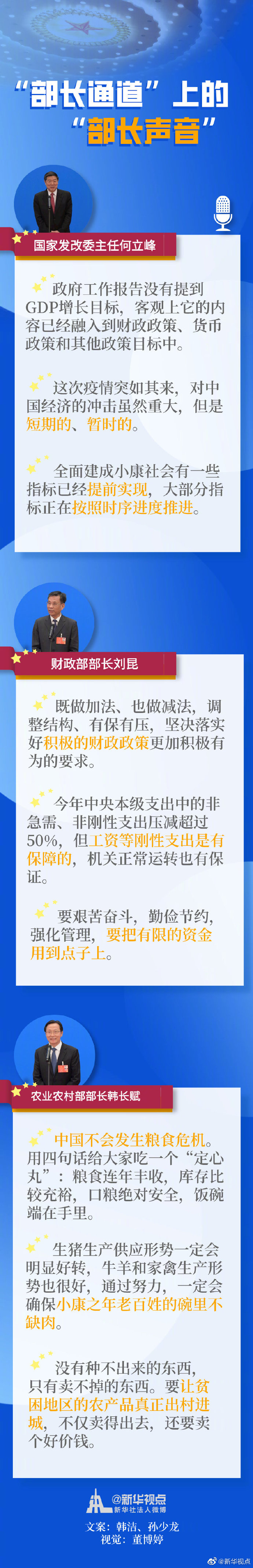 22日,國家發(fā)展改革委主任何立峰、財(cái)政部部長劉昆、農(nóng)業(yè)農(nóng)村部部長韓長賦先后亮相“部長通道”。部長們在答問之中,傳遞出哪些重要信息?一起聆聽“部長聲音”!
