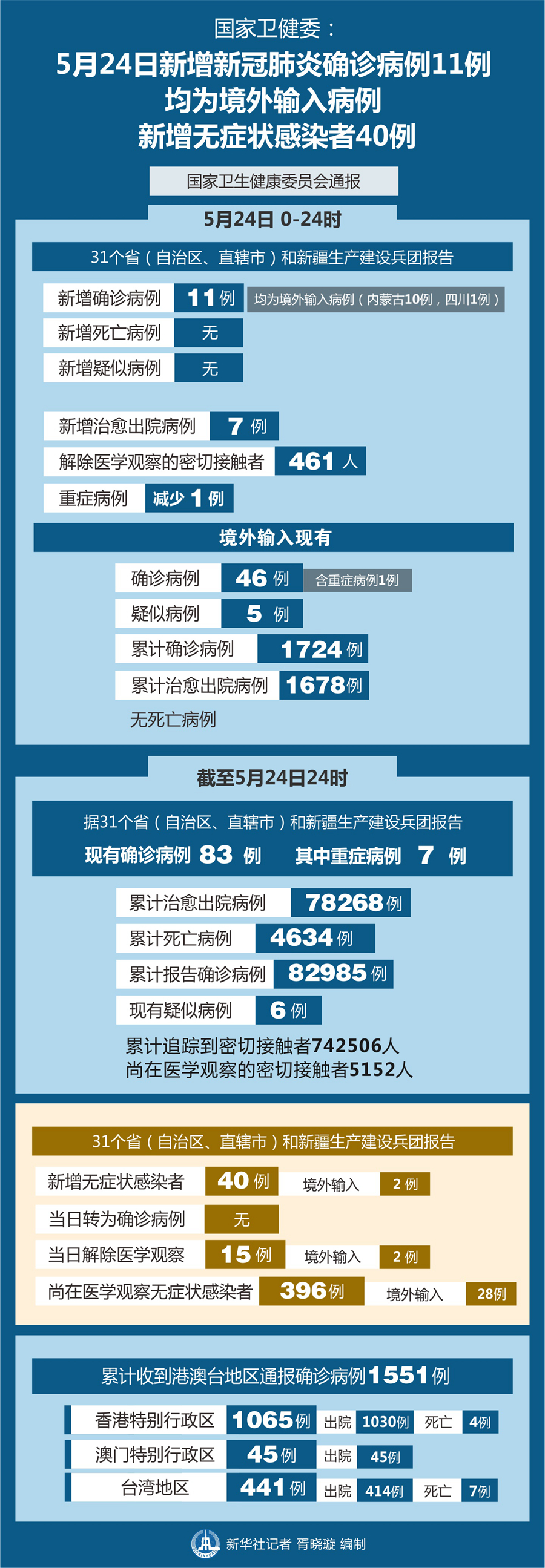 新華社北京5月25日電(記者王秉陽)國家衛(wèi)健委25日通報(bào),5月24日0-24時(shí),31個(gè)?。ㄗ灾螀^(qū)、直轄市)和新疆生產(chǎn)建設(shè)兵團(tuán)報(bào)告新增新冠肺炎確診病例11例,均為境外輸入病例(內(nèi)蒙古10例,四川1例);無新增死亡病例;無新增疑似病例。