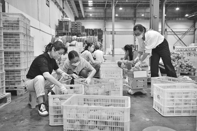6月18日,湖北省宜昌市夷陵區(qū)電商產(chǎn)業(yè)城工人對網(wǎng)民訂購的橙子進(jìn)行包裝準(zhǔn)備發(fā)貨。張國榮攝/光明圖片