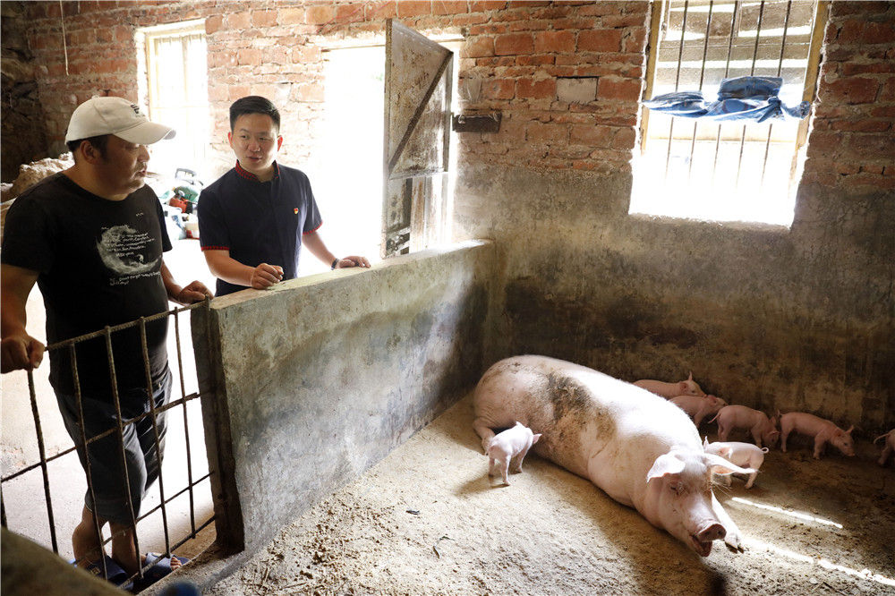 6月16日,趙少輝(右)在貧困戶盤良嫩的豬場(chǎng)了解情況。新華社記者 黃國保 攝