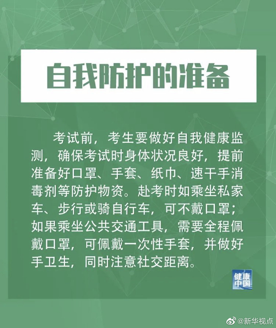 措施提到,低風(fēng)險地區(qū)的考生在進入考場前要佩戴口罩,進入考場就座后,可以自主決定是否佩戴;備用隔離考場和中高風(fēng)險地區(qū)的考生,要全程佩戴口罩。工作人員和監(jiān)考人員全程佩戴口罩,隔離考場的監(jiān)考員及工作人員須穿戴工作服、醫(yī)用防護口罩和一次性手套等,必要時可穿戴防護服。