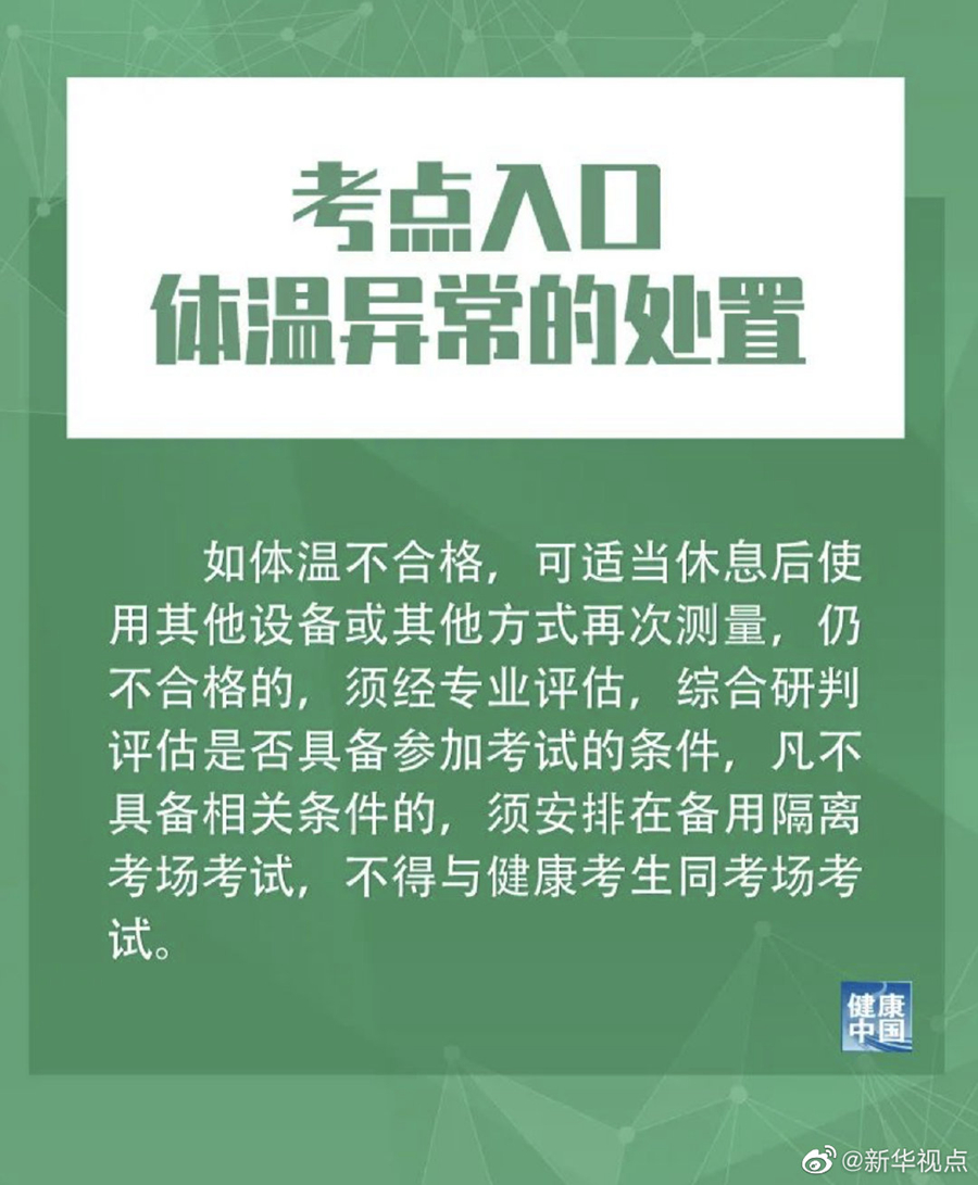 新華社北京6月25日電(記者王琳琳)國家衛(wèi)健委官網(wǎng)日前發(fā)布10條2020年高考防疫關(guān)鍵措施。其中提到,所有考生、考試工作人員體溫低于37.3℃方可進入考點。如體溫不合格,可適當休息后使用其他設(shè)備或其他方式再次測量,仍不合格的,須經(jīng)專業(yè)評估,綜合研判評估是否具備參加考試的條件,凡不具備相關(guān)條件的,須安排在備用隔離考場考試,不得與健康考生同考場考試。