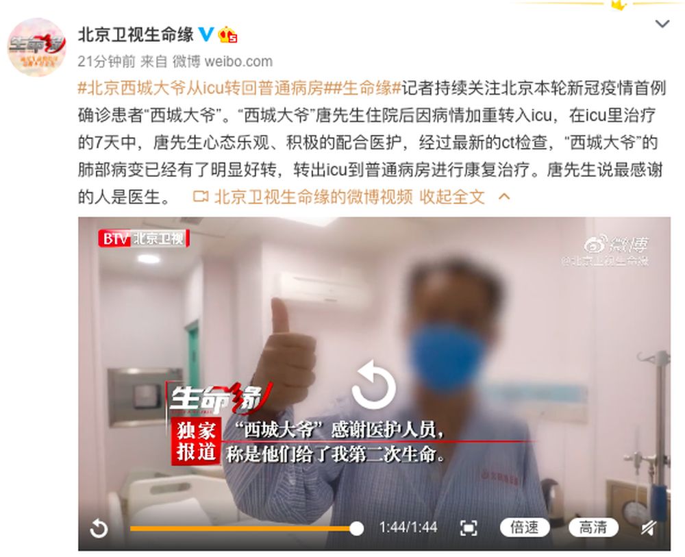 記者持續(xù)關(guān)注北京本輪新冠疫情首例確診患者“西城大爺”?!拔鞒谴鬆敗碧葡壬≡汉笠虿∏榧又剞D(zhuǎn)入ICU,在ICU治療的7天中,唐先生心態(tài)樂觀、積極配合醫(yī)護(hù),經(jīng)過最新的CT檢查,“西城大爺”的肺部病變已經(jīng)有了明顯好轉(zhuǎn),轉(zhuǎn)出ICU到普通病房進(jìn)行康復(fù)治療。唐先生說最感謝的人是醫(yī)生。