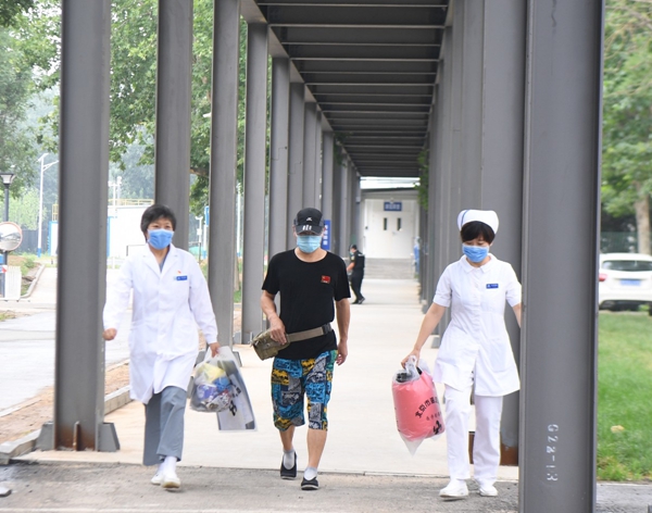 今天出院的老何戴著棒球帽,穿著黑色的短袖衫,綠底兒的沙灘褲,一身輕松。站在地壇醫(yī)院南門廣場,老何的口罩戴得嚴嚴實實,他說自己在新發(fā)地市場買點牛羊肉,口罩沒戴嚴實,“提醒咱們市民一定要做好防控,戴好口罩?!?/p>