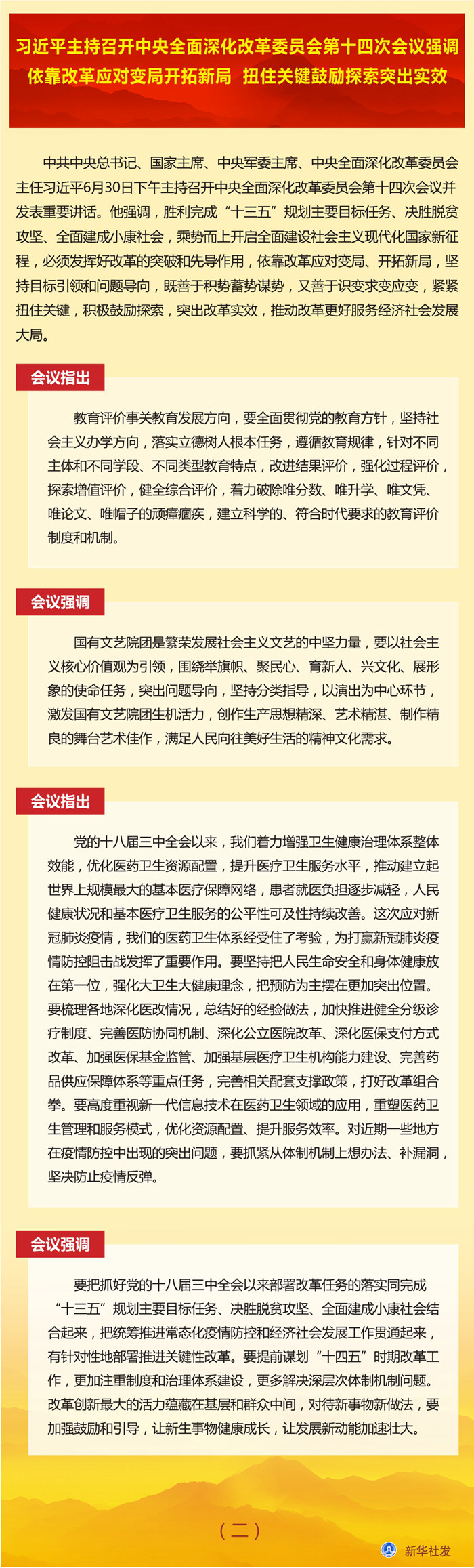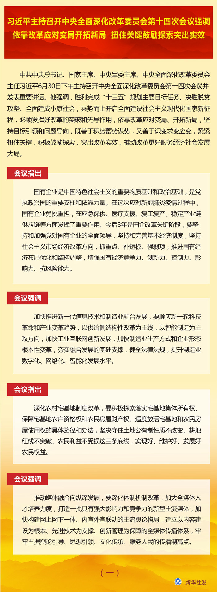 會議審議通過了《國企改革三年行動方案(2020-2022年)》、《關(guān)于深化新一代信息技術(shù)與制造業(yè)融合發(fā)展的指導意見》、《深化農(nóng)村宅基地制度改革試點方案》、《關(guān)于加快推進媒體深度融合發(fā)展的指導意見》、《深化新時代教育評價改革總體方案》、《關(guān)于深化國有文藝院團改革的實施意見》。會議還聽取了黨的十八屆三中全會以來醫(yī)藥衛(wèi)生體制改革進展情況匯報。