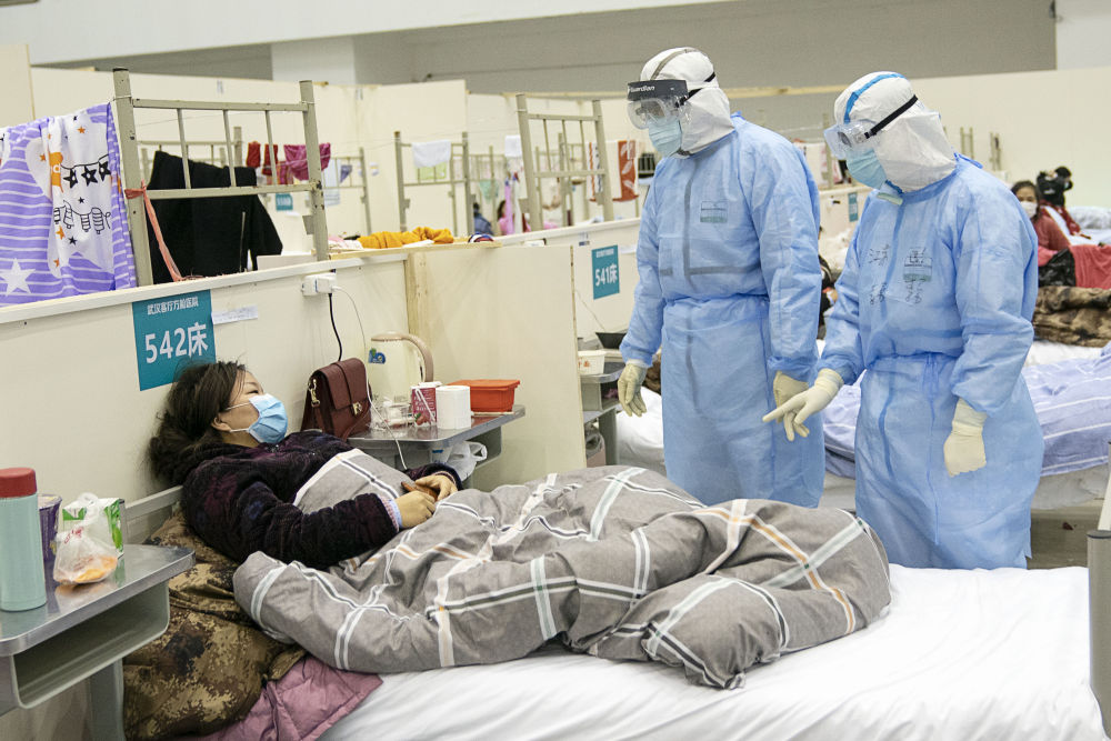 武漢客廳方艙醫(yī)院醫(yī)護(hù)人員在詢問患者病情(新華社記者熊琦攝)