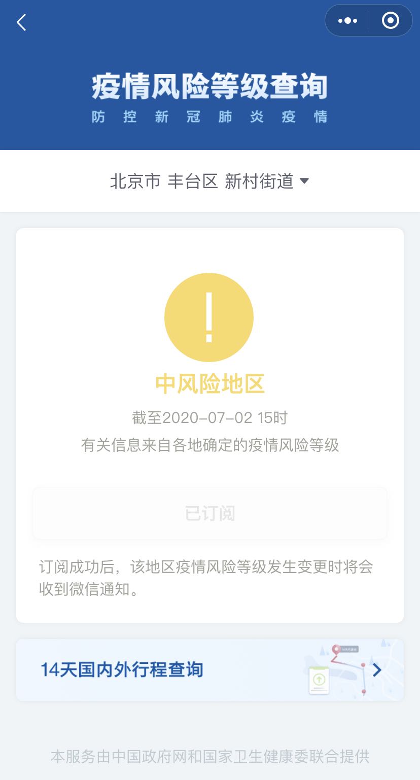 記者從國(guó)務(wù)院客戶端小程序“疫情風(fēng)險(xiǎn)等級(jí)查詢”了解到,截至7月2日15時(shí),北京市豐臺(tái)區(qū)新村街道由高風(fēng)險(xiǎn)地區(qū)降級(jí)為中風(fēng)險(xiǎn)地區(qū)。