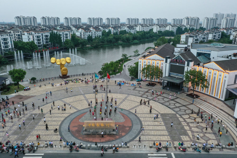 6月19日,居民在江蘇張家港永聯(lián)村的廣場跳舞(無人機照片)。新華社記者 楊磊 攝