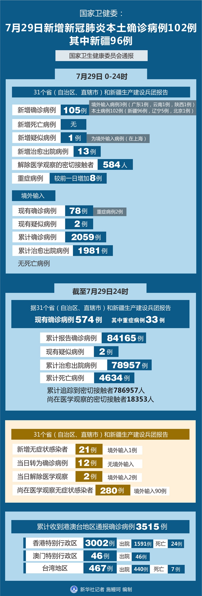 新華社北京7月30日電 國(guó)家衛(wèi)健委30日通報(bào),7月29日0—24時(shí),31個(gè)省(自治區(qū)、直轄市)和新疆生產(chǎn)建設(shè)兵團(tuán)報(bào)告新增確診新冠肺炎病例105例,其中境外輸入病例3例(廣東1例,云南1例,陜西1例),本土病例102例(新疆96例,遼寧5例,北京1例);無新增死亡病例;新增疑似病例1例,為境外輸入病例(在上海)。