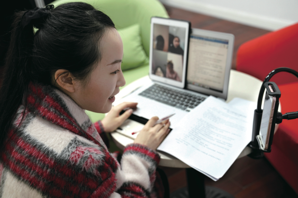 2月25日,上海市盧灣中學(xué)六(五)班的班主任陳溦雯與學(xué)生們?cè)诰€互動(dòng),圍繞防疫主題開(kāi)展一堂“云班會(huì)” ( 劉穎/攝 )