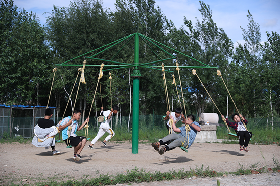 孟文龍民宿院內(nèi)鄂溫克少年在玩旋轉(zhuǎn)秋千。新華網(wǎng)記者焦鵬攝