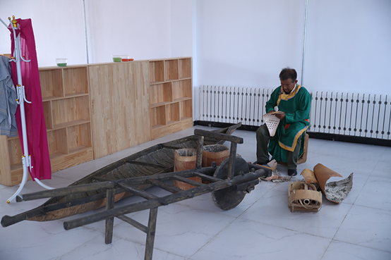 在獵民村手工藝工坊記者見到年輕時(shí)打過獵、扎過撮羅子(狩獵和游牧民族的一種圓錐形“房子”)的那春林,他正在用樺樹皮制作蟈蟈籠子。鄂溫克人會(huì)在籠子里放上蟈蟈,把蟈蟈當(dāng)作魚餌帶到阿倫河釣細(xì)鱗魚。他身旁的樺樹皮船、儲(chǔ)物筒、刀具配件都是用樺樹皮制作的。那春林說今年已接到一批展品訂單,預(yù)計(jì)可以收入4萬塊錢,家里流轉(zhuǎn)的土地還可以為他帶來3萬多元收入。