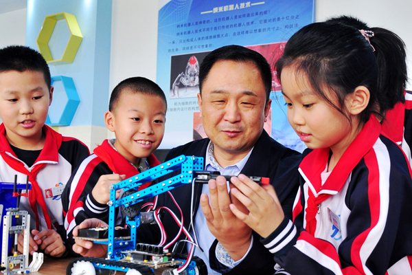 楊國營與學(xué)生在機(jī)器人課上