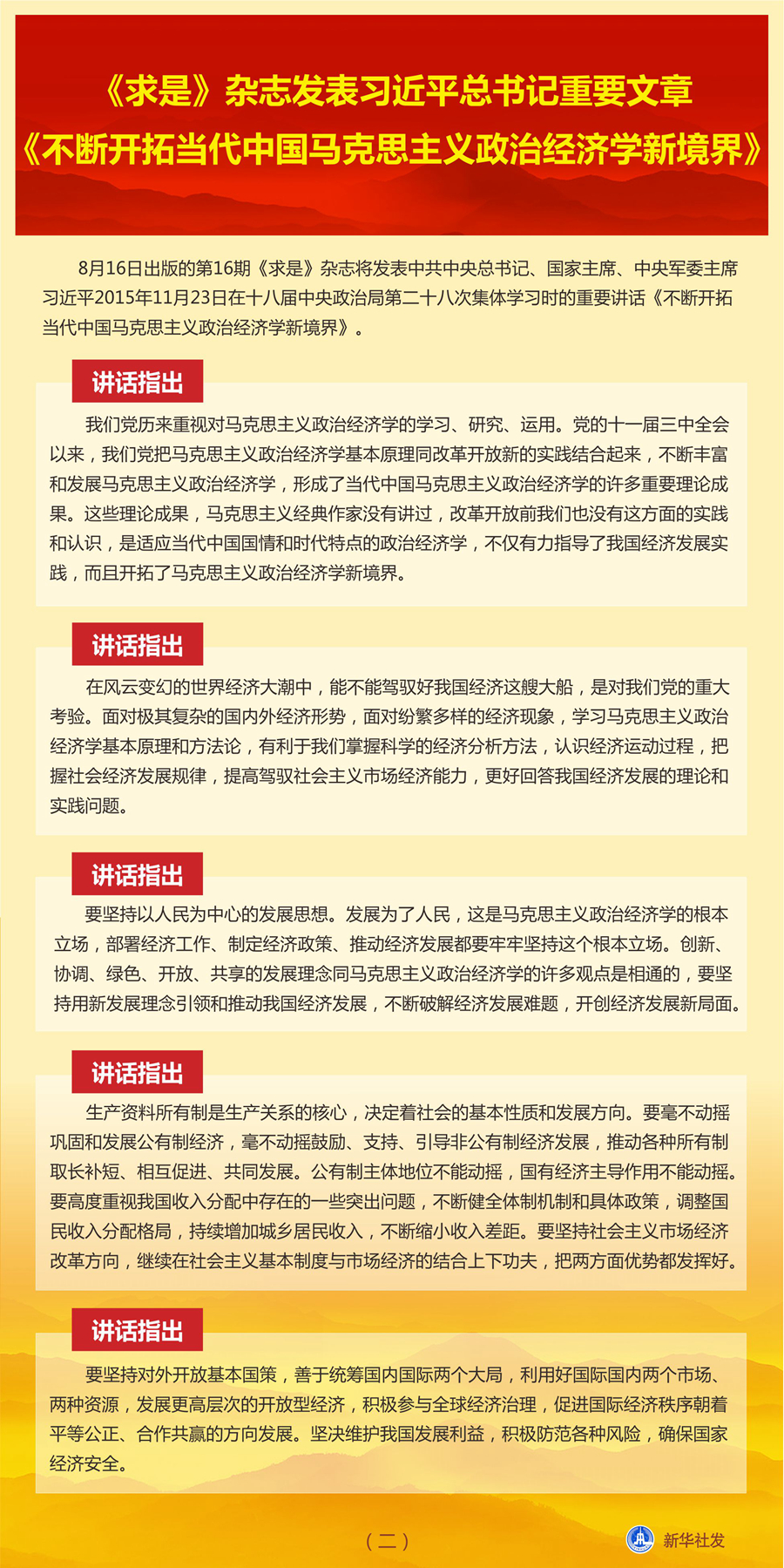 新華社北京8月15日電 8月16日出版的第16期《求是》雜志將發(fā)表中共中央總書記、國家主席、中央軍委主席習近平2015年11月23日在十八屆中央政治局第二十八次集體學習時的重要講話《不斷開拓當代中國馬克思主義政治經(jīng)濟學新境界》。