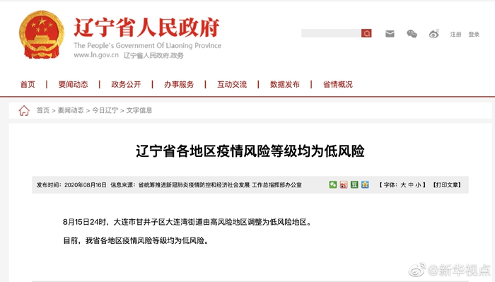 8月15日24時(shí),大連市甘井子區(qū)大連灣街道由高風(fēng)險(xiǎn)地區(qū)調(diào)整為低風(fēng)險(xiǎn)地區(qū)。目前,遼寧省各地區(qū)疫情風(fēng)險(xiǎn)等級均為低風(fēng)險(xiǎn)。?