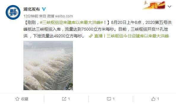 據(jù)湖北省人民政府新聞辦公室官方微博消息,三峽樞紐迎來建庫以來最大洪峰,當(dāng)日上午8點(diǎn),2020第五號(hào)洪峰抵達(dá)三峽樞紐入庫,流量達(dá)到75000立方米每秒。