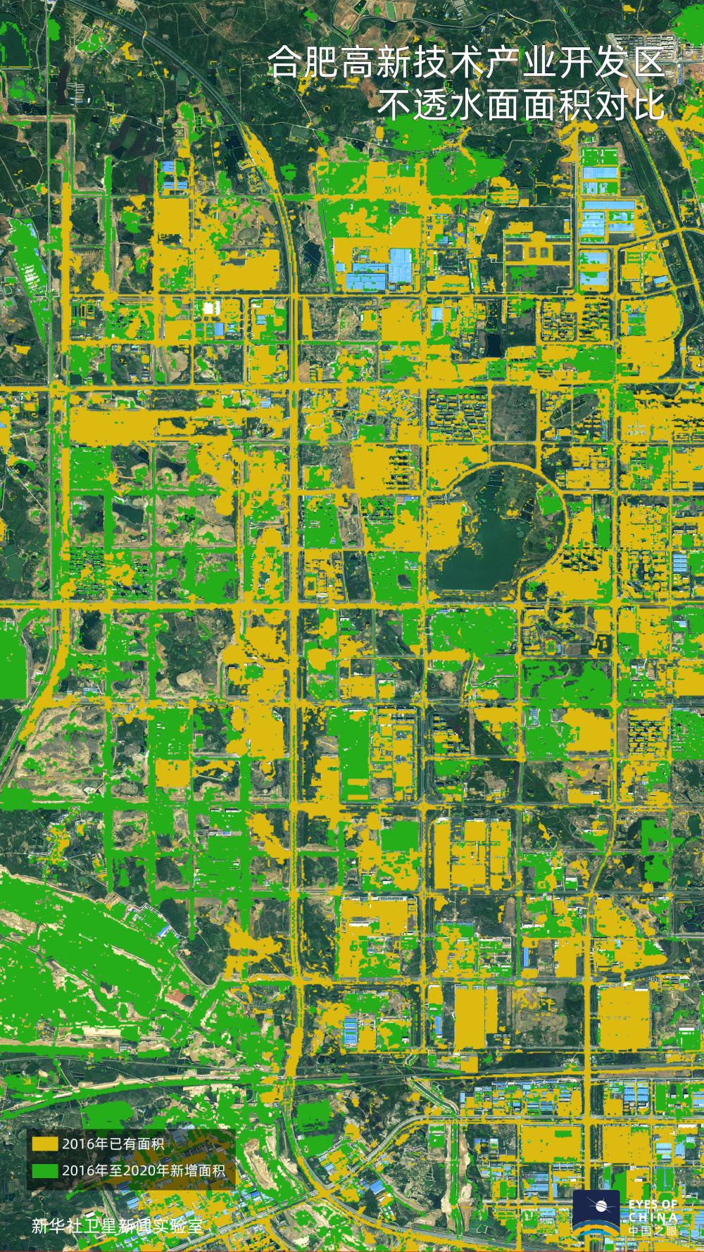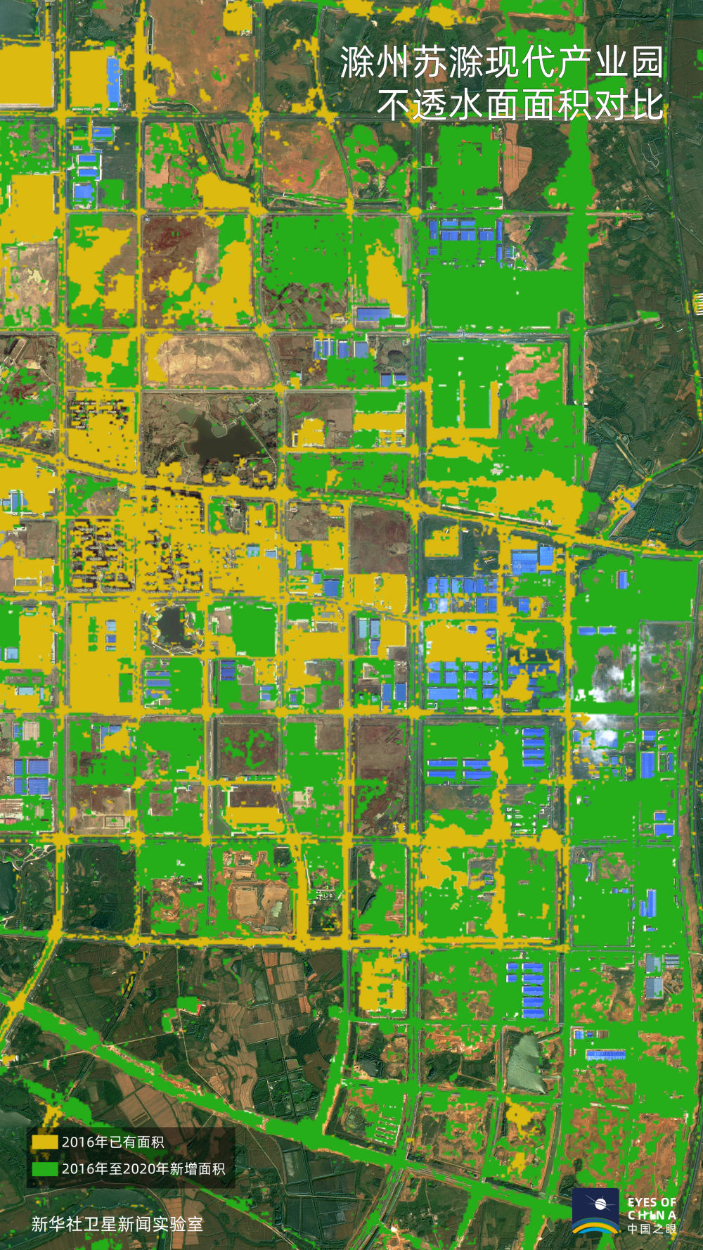 黃色覆蓋區(qū)域為2016年已有不透水面區(qū)域,綠色為2020年較2016年新增區(qū)域。大幅增加的綠色顯示,滁州和合肥的工業(yè)園區(qū)范圍在快速向外延伸,經(jīng)濟(jì)發(fā)展邁上新臺階。